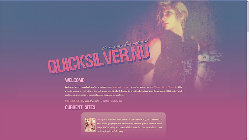 Quicksilver.nu was purchased in June of 2017 as I had the desire to put my websites back online and begin making character shrines and fanlistings again. Although I still had one of my old domains that I've used previously, I really wanted something fandom-related.